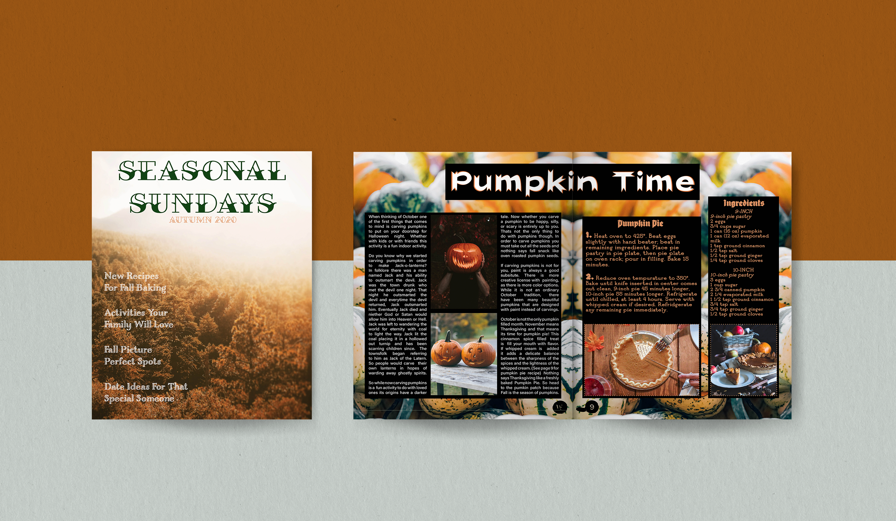 I designed focusing on layouts, editorial design, and typography. Themed around the months of Autumn and activities readers might be drawn to.